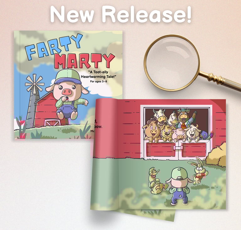 Say hello to Marty, a sweet little pig with an unexpectedly powerful talent: he toots louder than a tractor on market day. Marty tries his best to keep his toots quiet, but no matter what he does, they always seem to burst out at the worst possible moment.